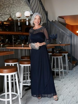 Women’s Long Mother of The Bride Dress with Stretch Lace Bodice & Hip Embellishment (Petite and Regular Sizes)
