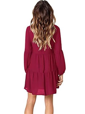 Women’s Solid V-Neck Lantern Sleeve Casual Dress Flowy Swing Shift Loose Comfortable Dresses