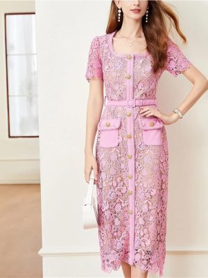 Women’s French Knitted Slim A-Line Dress V Neck Short Sleeve Button Hollow Out Sweater Summer Dresses