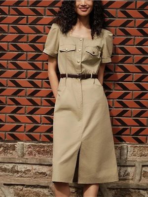 Women’s Vintage Washed Fabric Midi Dress Square Neck Split Single Breasted Summer Fashion Work Dresses